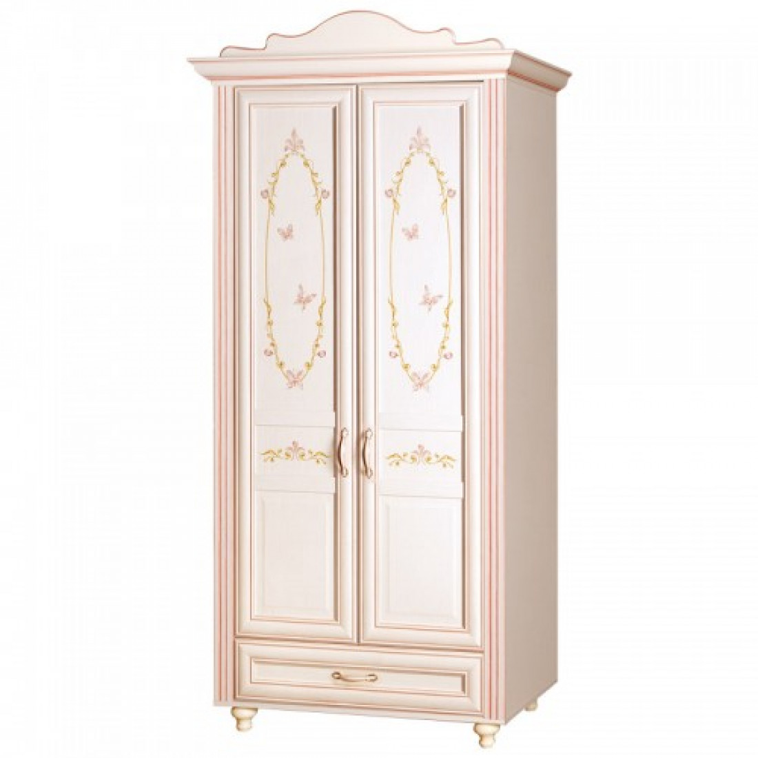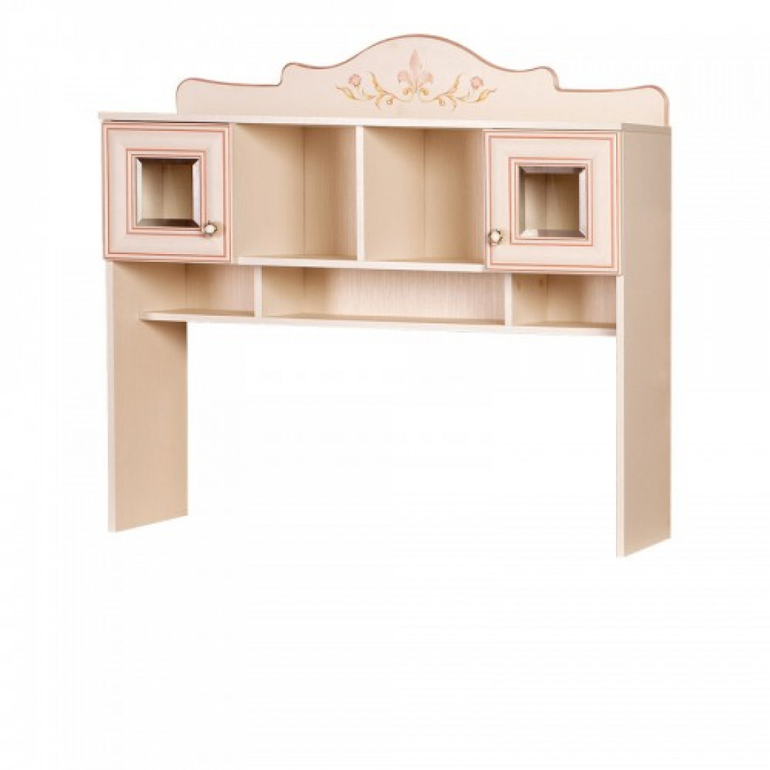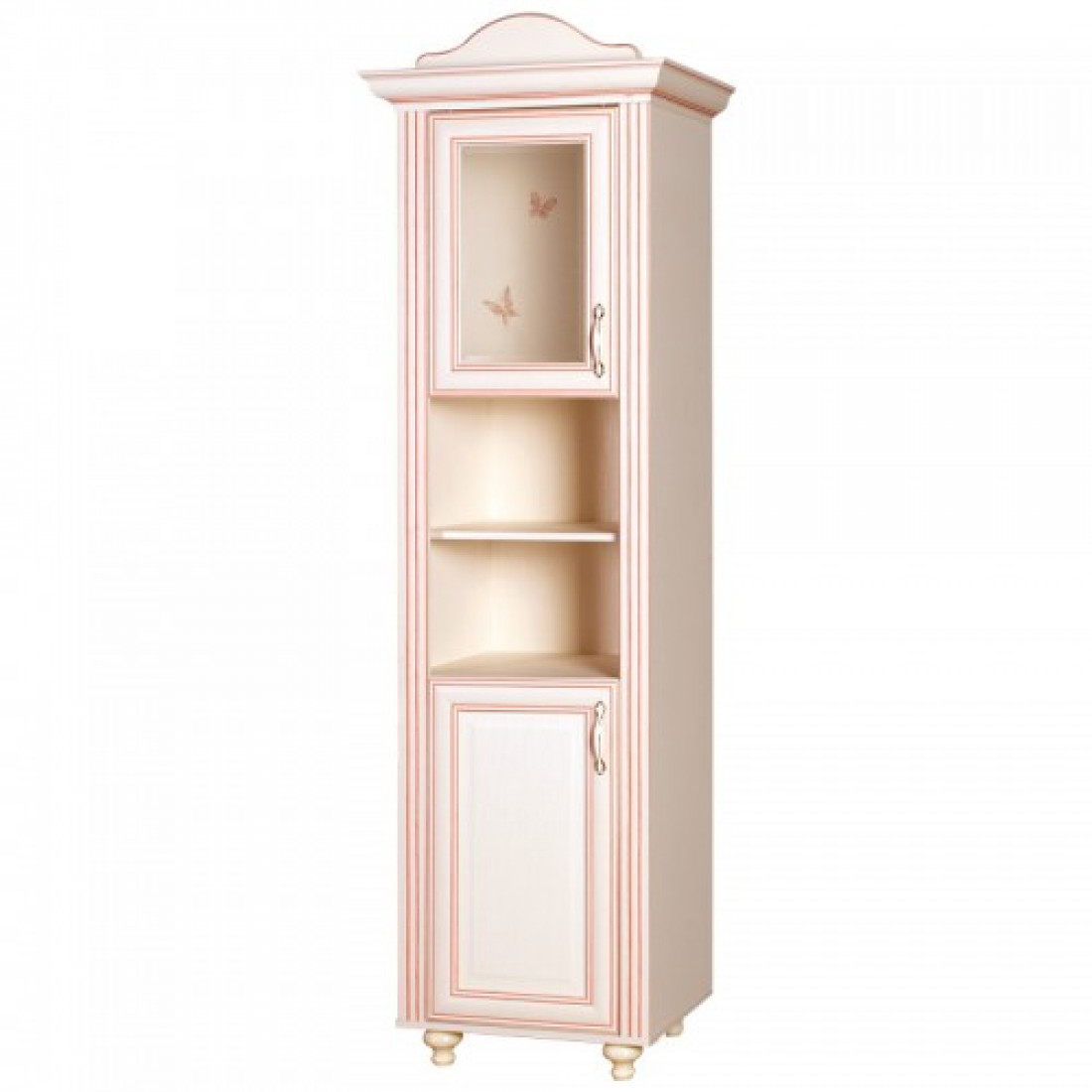Фасады: МДФ, декор – кремовый белый, рисунок, патина, стекло с фацетом и рисунком