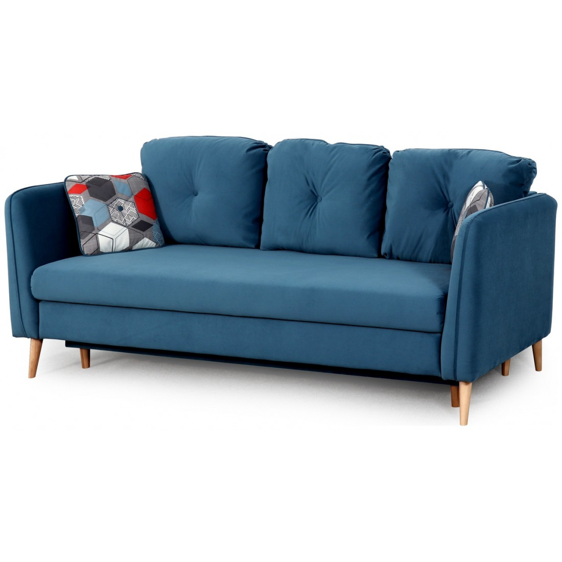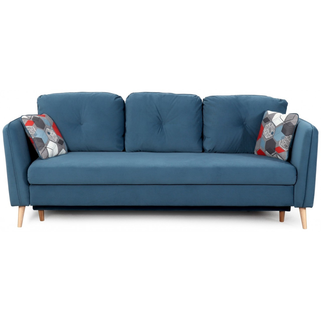 Диван украшают декоративная отстрочка, декоративные утяжки с пуговицами на подушках. Опоры дивана из массива березы подчеркивают стилистику.