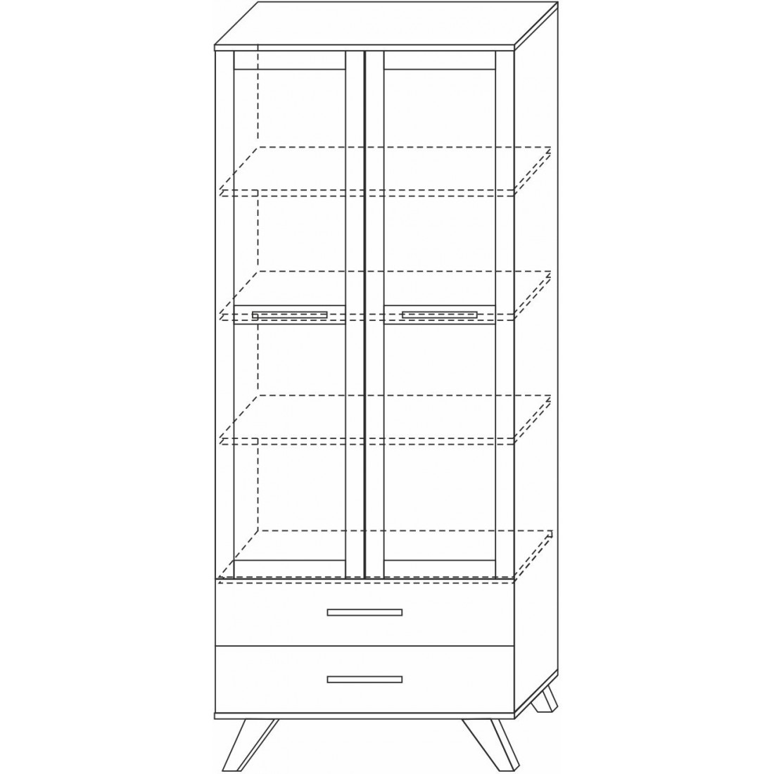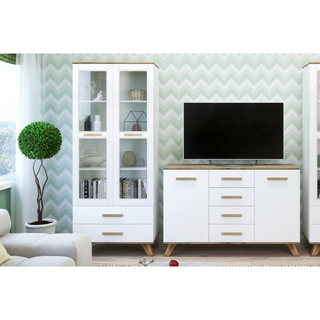 Витрины с прозрачным стеклом и многофункциональный комод в скандинавском стиле. Витрины позволят хранить посуду, книги и другие вещи. В нижней части шкафов-витрин предусмотрены выдвижные ящики. В центральной части композиции стоит большой комод - это вместительный элемент гостиной с ящиками и дверцами, который служит для размещения различных элементов, а так же телевизора. набор мебели представлен в исполнении ЛДСП «Дуб каньон» + «белый», фасады - МДФ в пленке ПВХ «глянец белый».