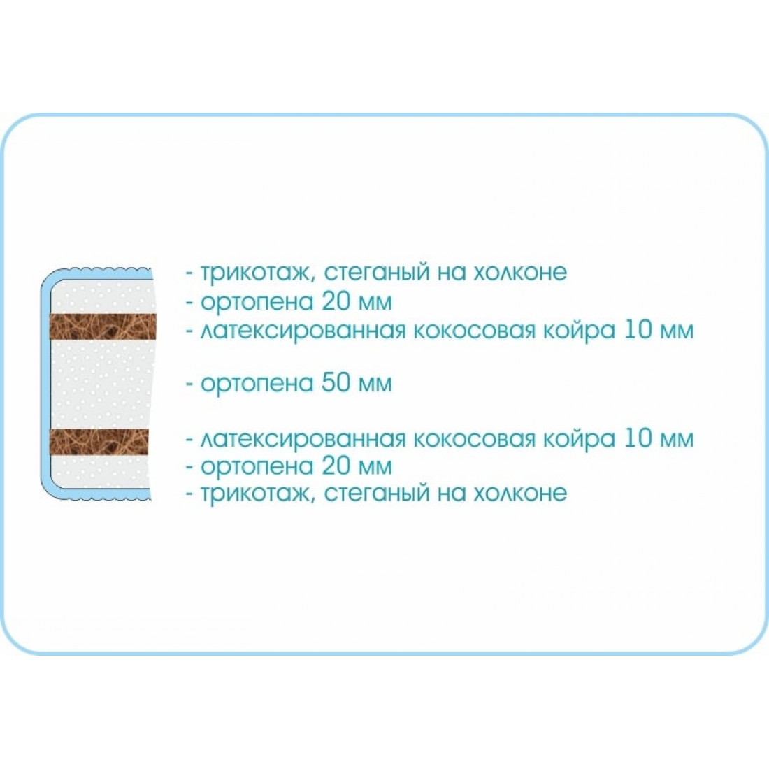 Наполнение: ортопена 50 мм, кокосовая плита 10 мм с двух сторон, ортопена 20 мм с двух сторон.