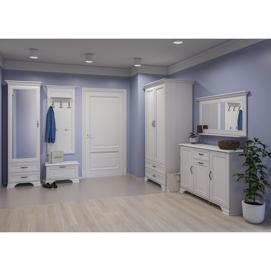 Мебель для прихожей Юнона от фабрики Мебель-Неман композиция 3 - новинка 2019 года в классическом стиле с отделкой структурной фактуры, обрамленная рамочным фасадом, где металлические ручки выгодно подчёркивают стиль и изящество, всегда актуален и востребован.
