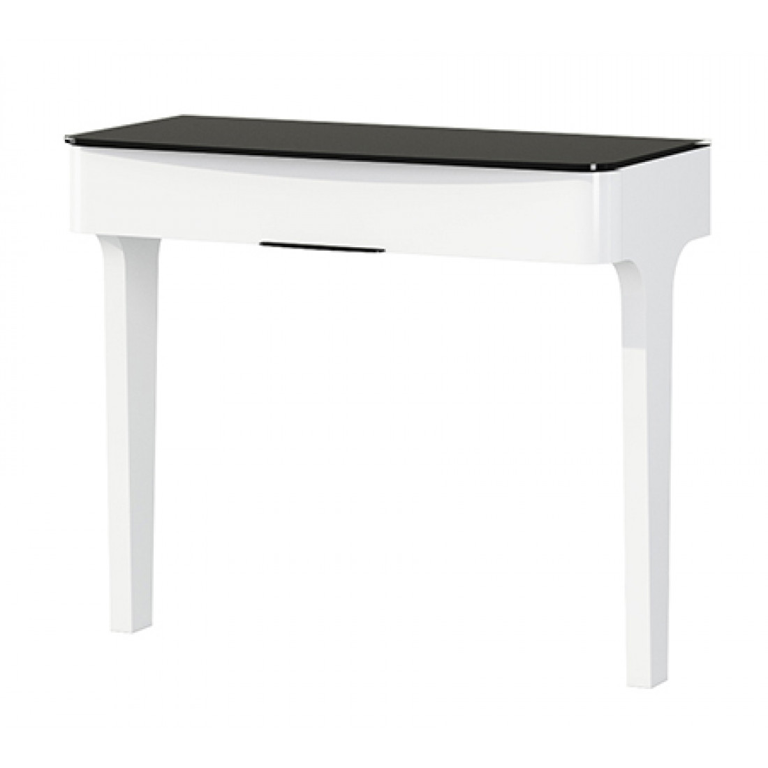 Пристенный туалетный столик в спальню МН-024-07 серии Верона от Мебель-Неман представляет собой легкую консольную конструкцию, с изящными ножками, выдвижным ящиком и черной глянцевой столешницей. Купить белый приставной столик можно в качестве изящного туалетного столика или полки.