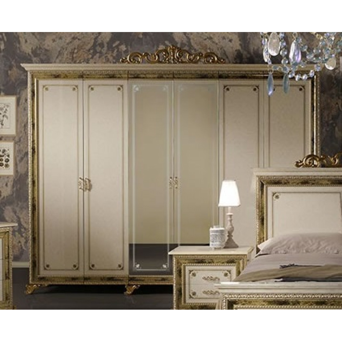 Шестистворчатый шкаф для одежды Катя (беж) от Российской фабрики «ДИА мебель» выполнен в бежевом цвете с глянцевым покрытием и резными вставками на фасадах, покрытые золотым цветом. Шкаф поделен на три большие части. Каждая из которых имеет не только полки для одежды но и большую штангу для вешалок. Такой большой и вместительный шкаф будет незаменимым модулем для вашей спальни.
