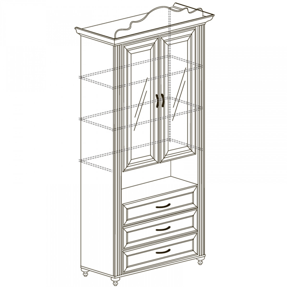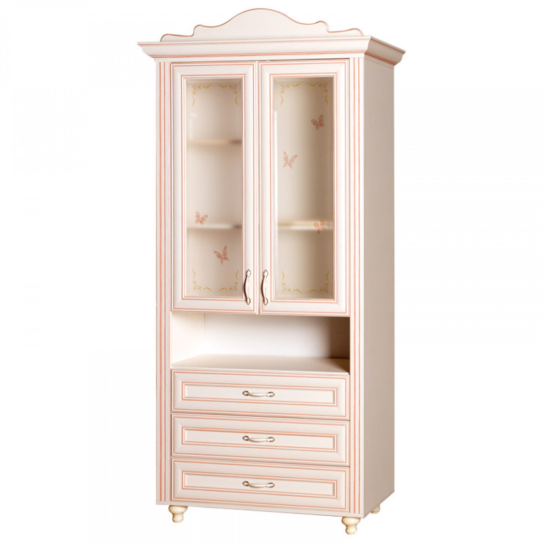 Фасады: МДФ, декор – кремовый белый, рисунок, патина, стекло с фацетом и рисунком