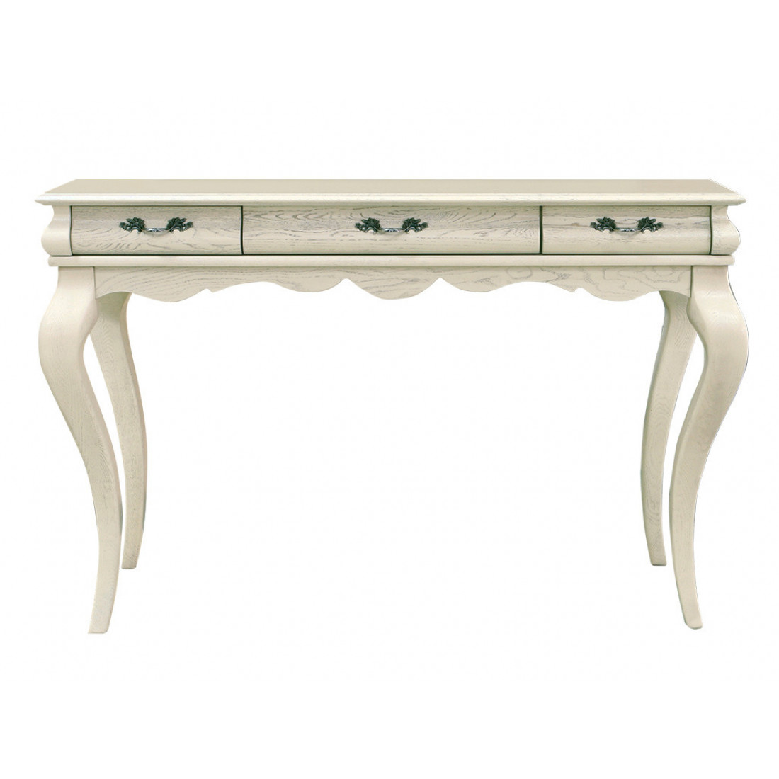 Изящный туалетный столик продолжает модельный ряд коллекции мебели для спальни "Оскар". Столик декорирован изогнутыми ножками и удачно сочетающейся с ними нижней кромкой в форме волны. Выдвижные ящики на направляющих бесшумного выдвижения, дно выложено велюром. Фасад сделан из массива дуба, окрашен в оттенок "Белая эмаль с патиной".
