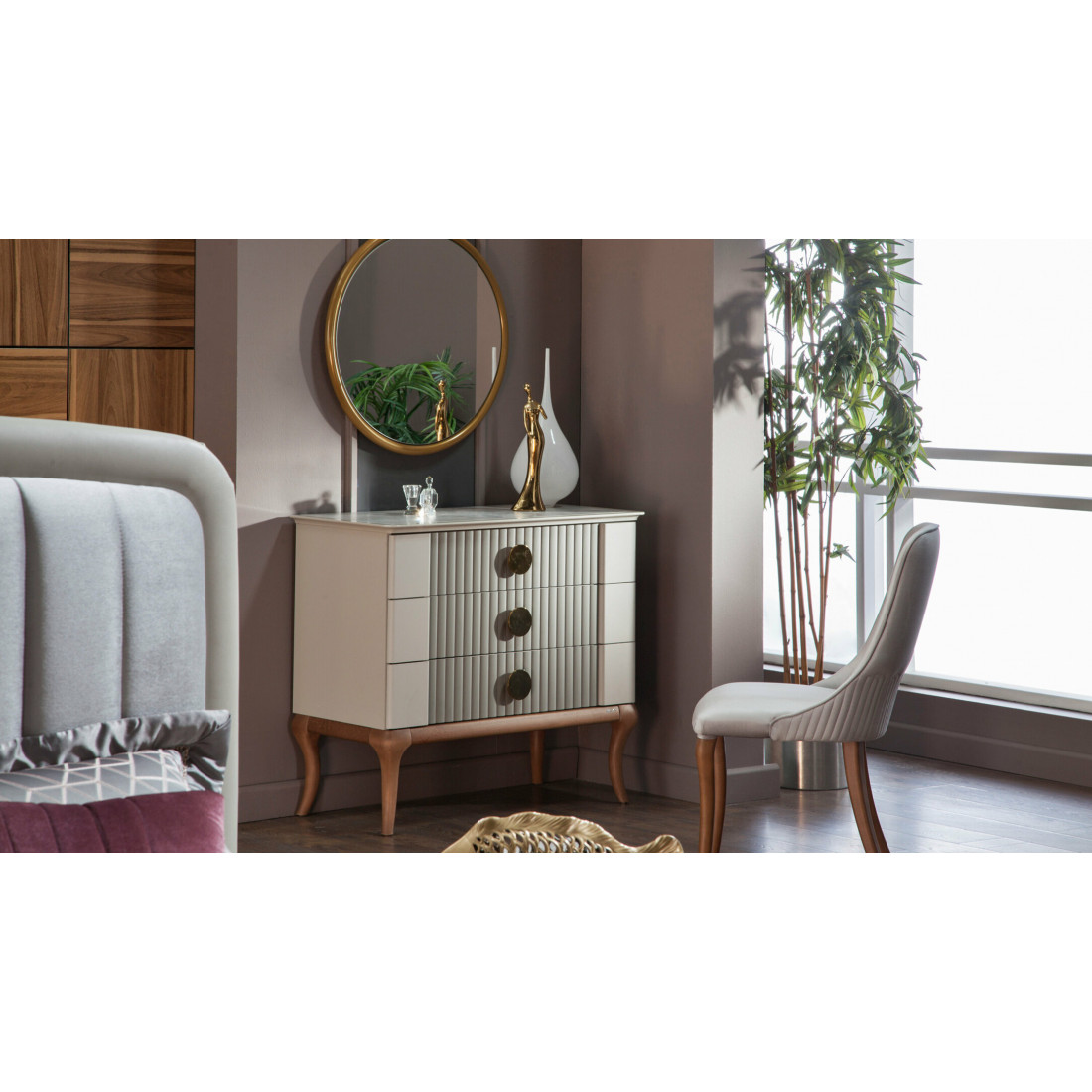 Туалетный столик "Песаро" выполнен в стиле неоклассика. Интересная текстура дерева подчеркивает уникальность среди конкурентов, а идеально подобранные размеры изделия делают его крайне удобным для использования.