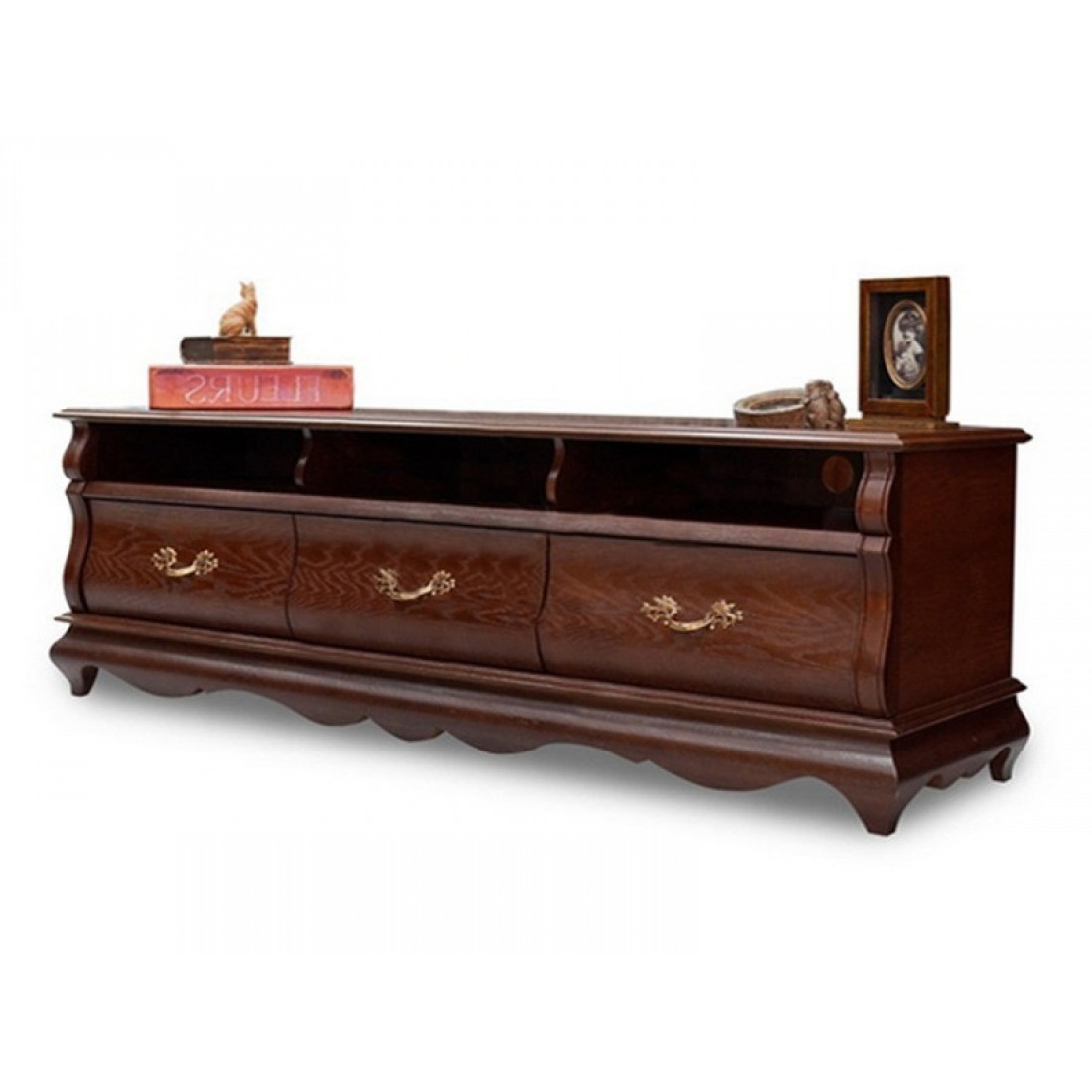 Оригинальная широкая тумба для гостиной из коллекции классической мебели "Оскар" оптимальный вариант для интерьера Вашей комнаты. В декор модели входят резной каркас и плавные изгибы фасада. Три выдвижных ящика на направляющих. Модель выполнена с использованием массива и шпона дуба и окрашена в оттенок "Орех".