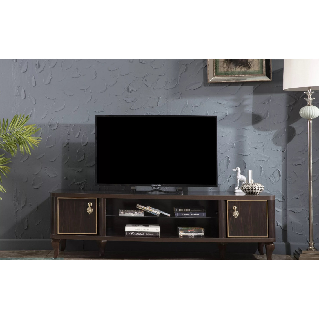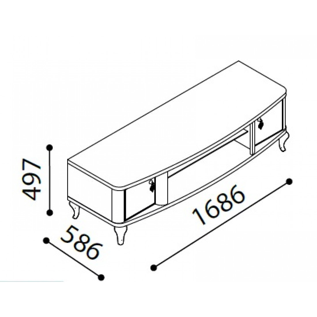 Тумба под ТВ "Легенда" предназначена для размещения большого плазменного телевизора. Ее дизайн заслуживает Вашего внимания, изделие представлено в классическом белом стиле с золотистыми полосами на дверцах и белыми изогнутыми сужающимися к полу ножками. По центру тумбы находится углубление под два отделения, разделенные стеклянной полкой. За счет использования высококачественных материалов, удалось добиться долговечности данного изделия.