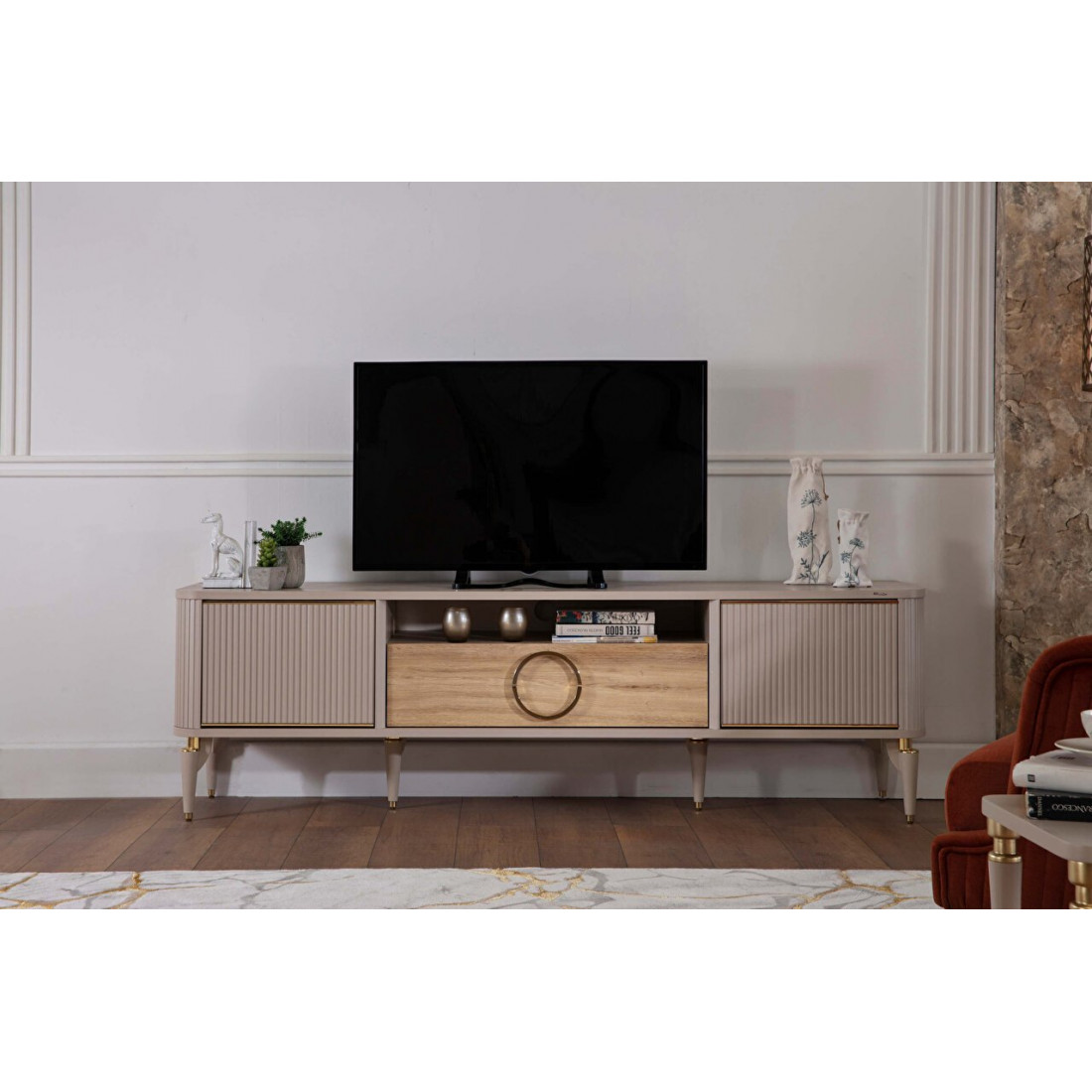 Тумба под ТВ Санвито SANVITO SANV-15 от турецкого производителя Bellona выполнена в современном стиле. Она отлично впишется в интерьер вашей гостиной. Позволит разместить большую плазму или домашний кинотеатр. Негромоздкая, утонченная по своему дизайну, тумба офрмлена в теплых, светлых тонах кремового оттенка в сочетании древесной фактуры. Боковые фасады декорированы по периметру золотой каймой, а центральный ящик круглой металлической ручкой. Как и другие элементы данной коллекции, кремовые фасады имеют рифленую поверхность, а уголки тумбочки закруглены.