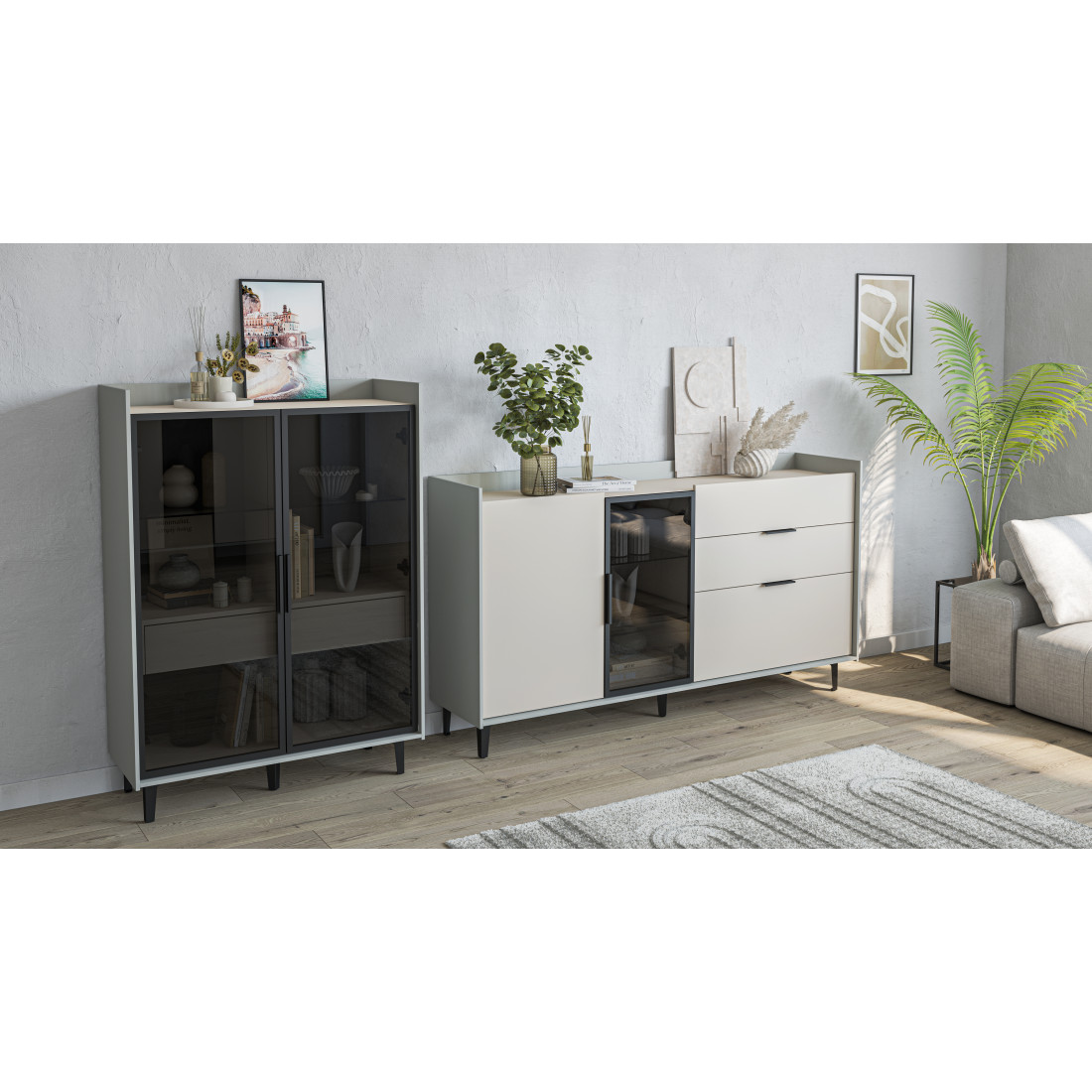 Элегантная тумба Модена создает идеальный акцент в вашей гостиной. Выберите из трех стильных вариантов цветов: Белый-Дуб Элисон, Лунный камень-жемчуг, Металл Бруклин-лунный жемчуг. Ножки из металла с регулировкой обеспечивают стабильность. Эта большая тумба идеально подходит для размещения телевизора и хранения посуды. Тумба оснащена темным стеклом и имеет три отделения: первое с двумя полками, второе с двумя стеклянными полками и фасадом из стекла, третье с тремя удобными ящиками. Функциональность и стиль объединяются в этой тумбе, делая ее идеальным дополнением к вашему интерьеру гостиной