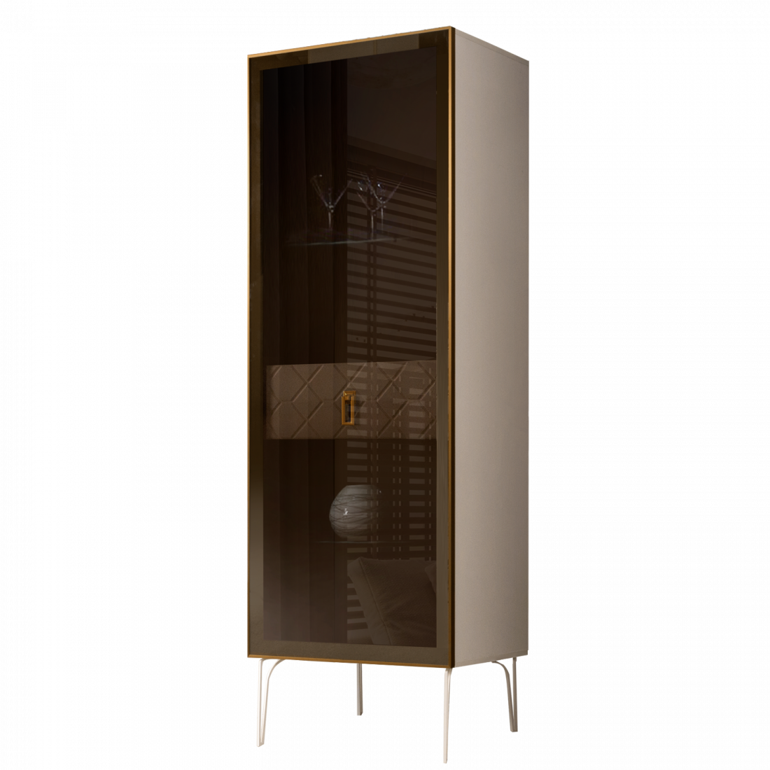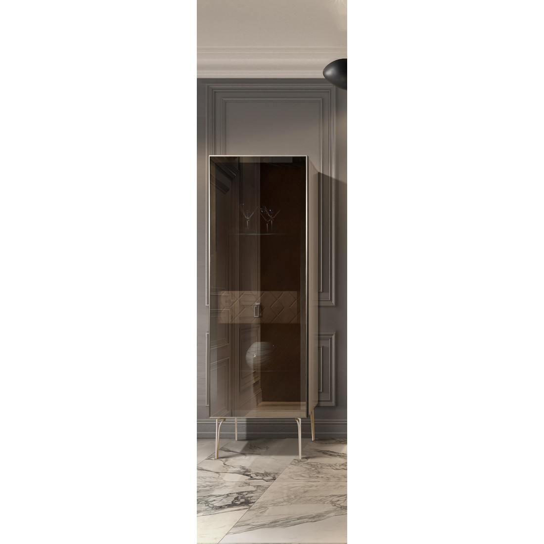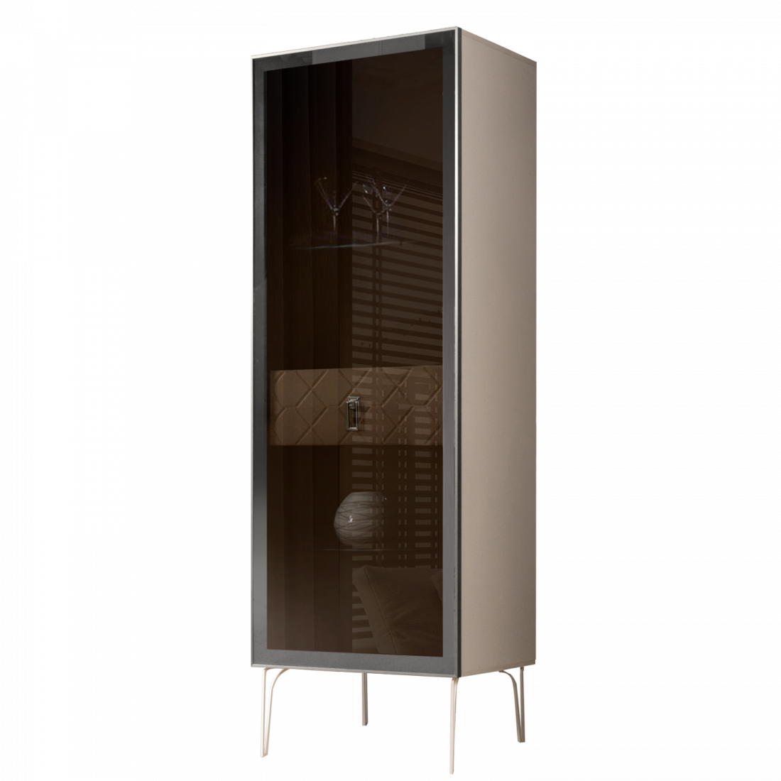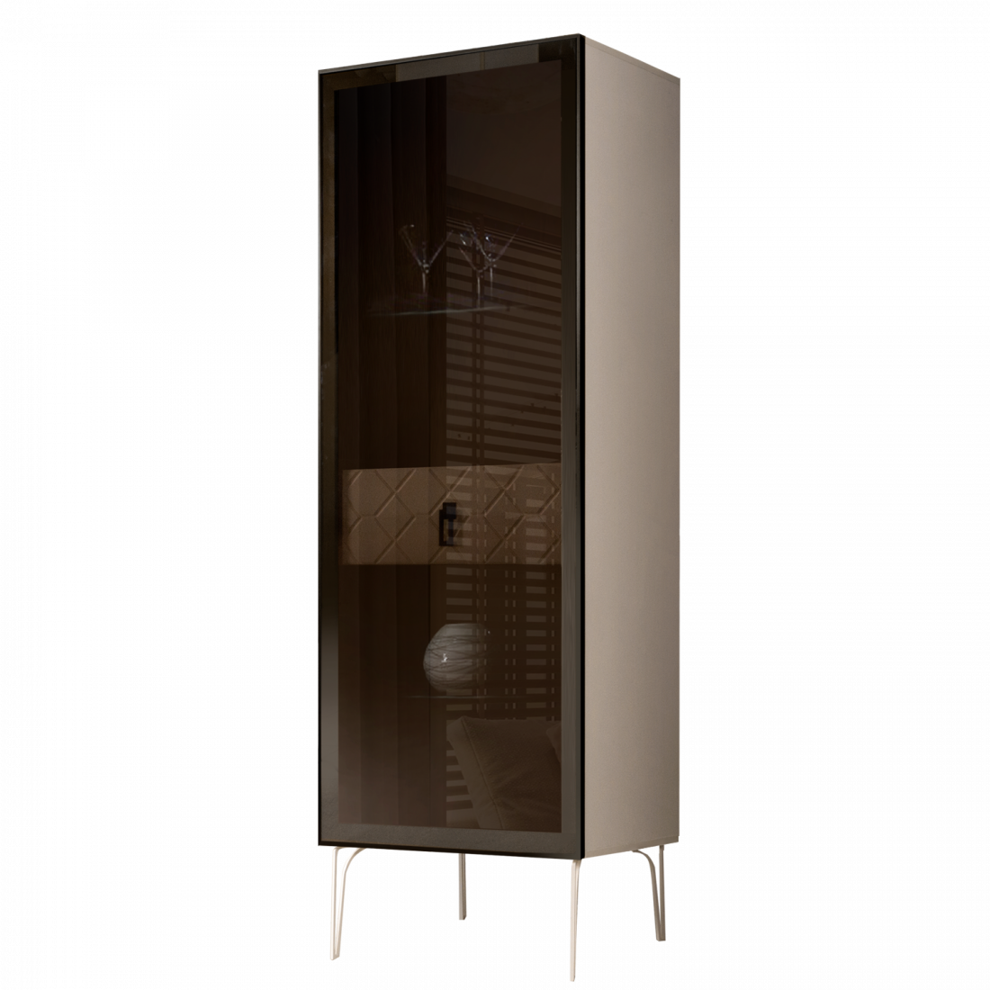 Стекло Stopsol меняет свои отражающие свойства под воздействием источников света. Поверхность, отражающая свет, мягко скроет содержимое вашего комода или витрины.